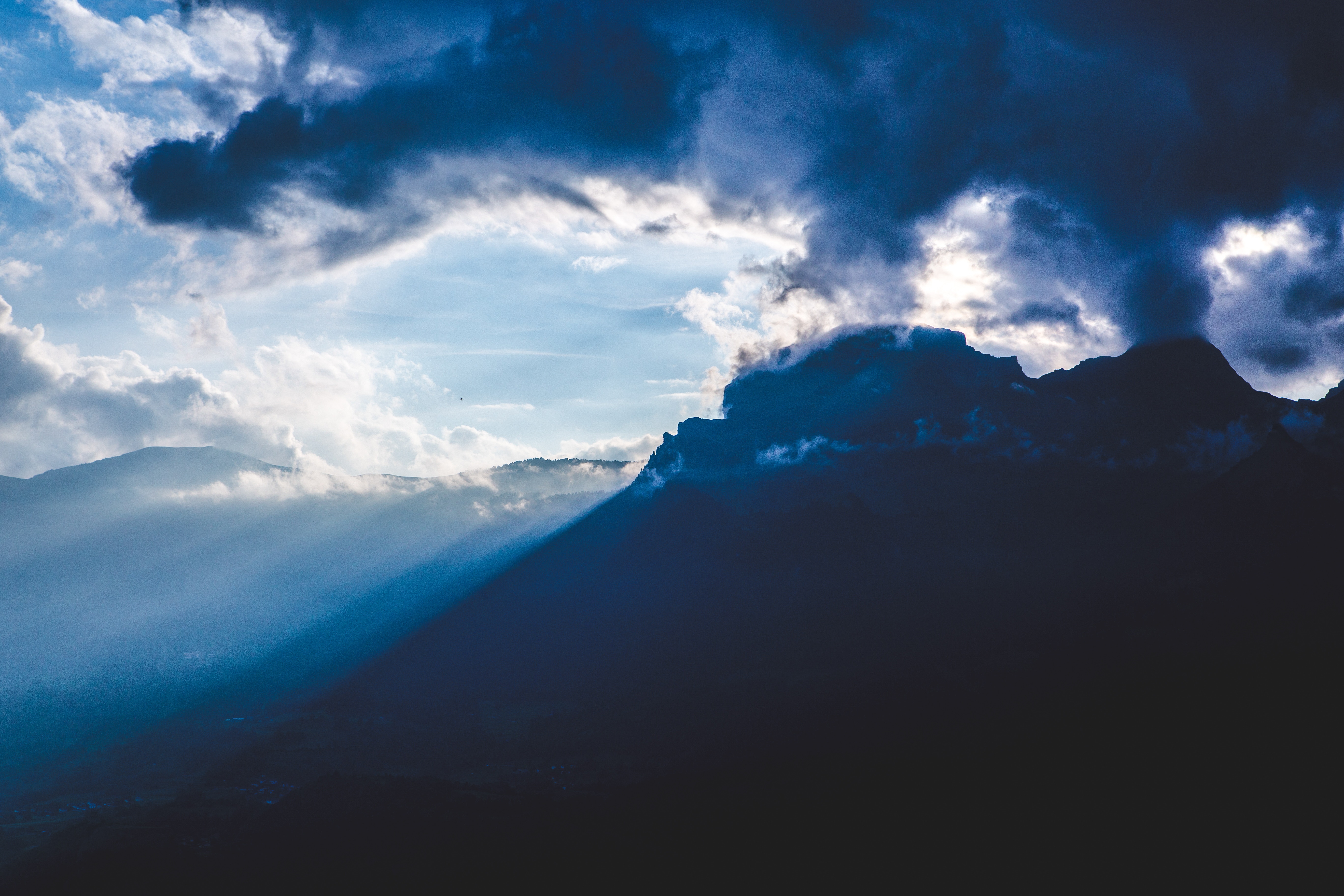 5472×3648 2.95 Mb mountains dark clouds nature beams rays fog foot